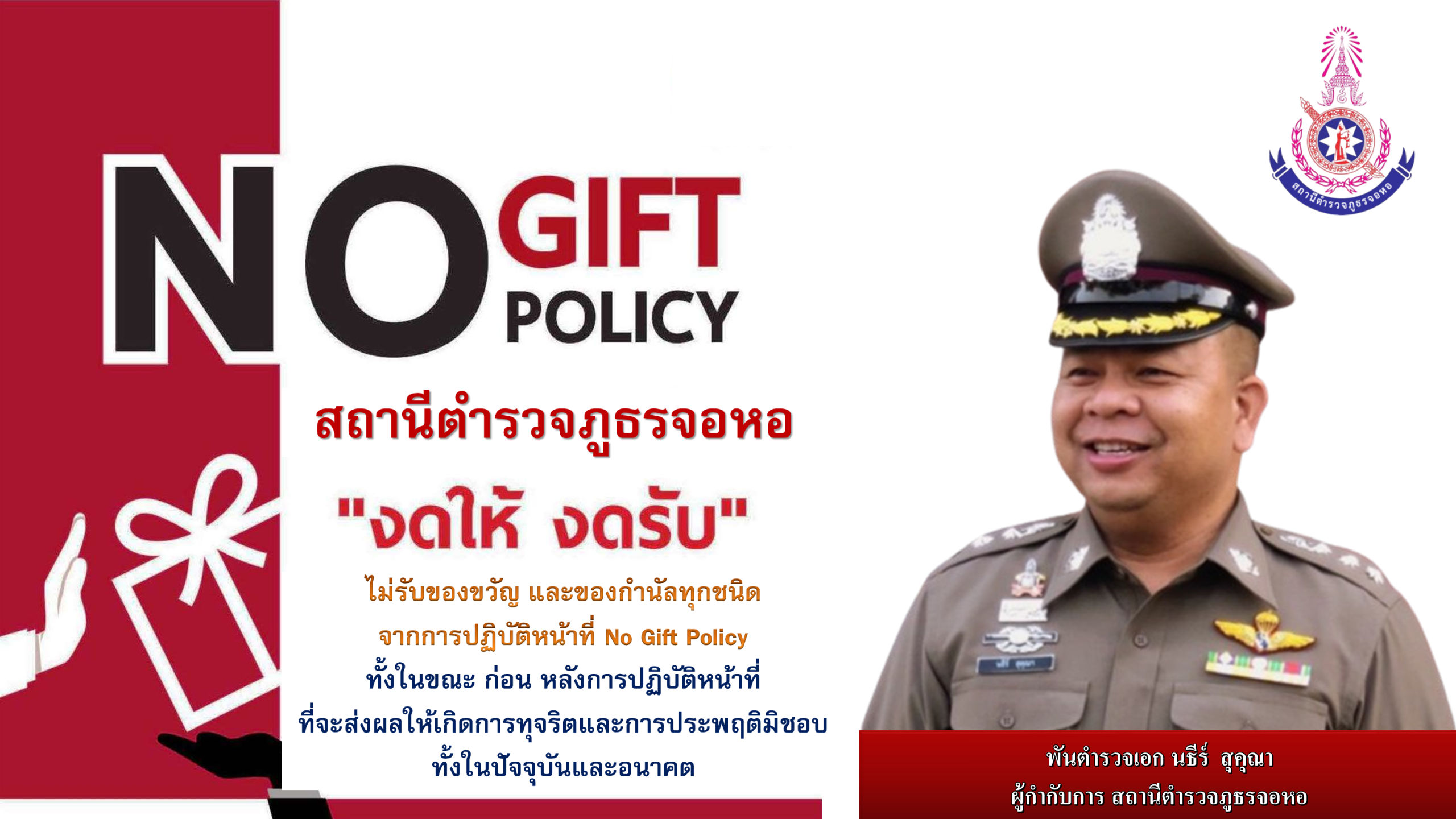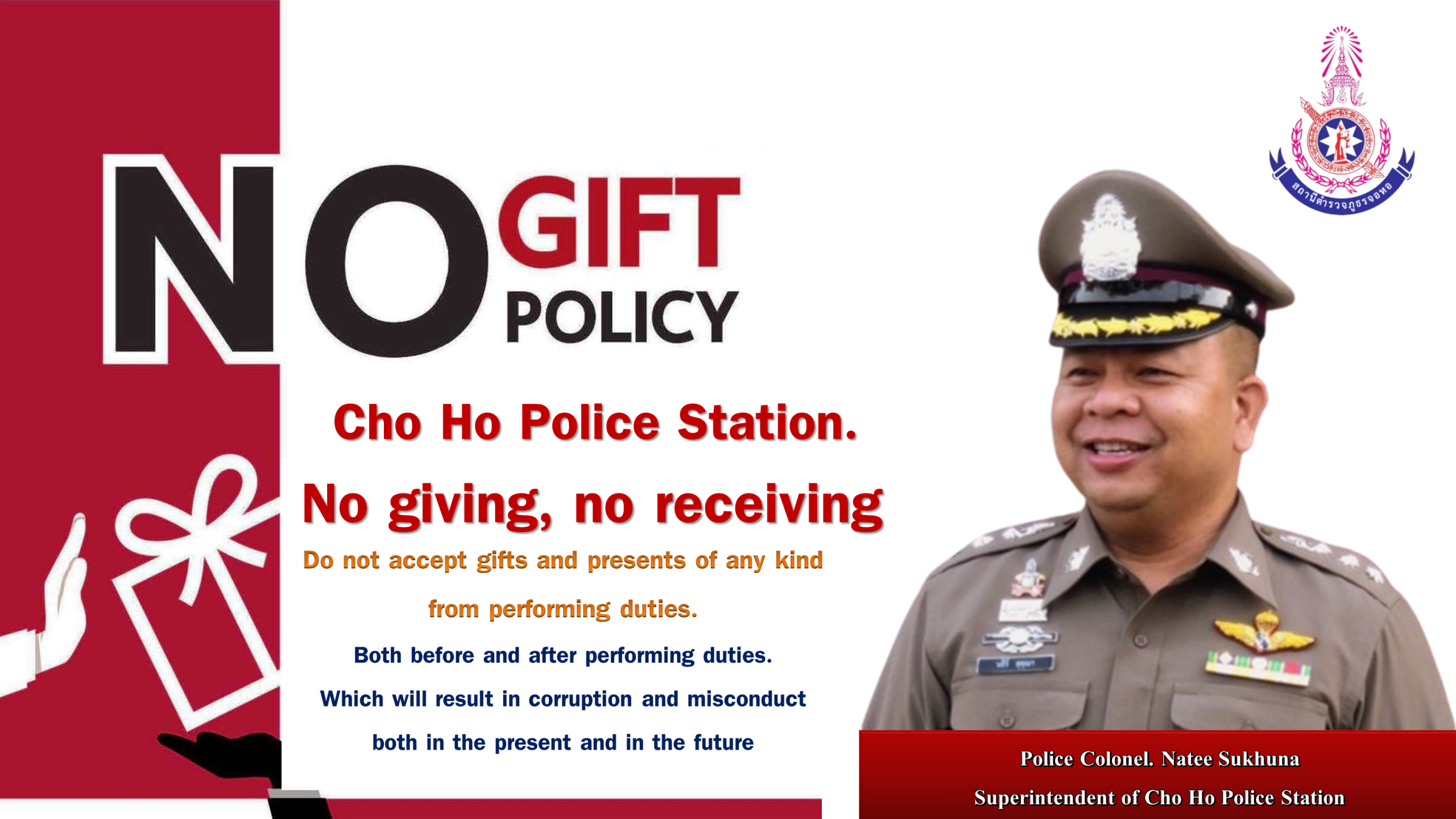 - ประกาศสำนักงานยุทธศาสตร์ตำรวจเรื่องเจตนารมณ์ที่จะไม่รับของขวัญหรือของกำนัลทุกชนิดจากการปฏิบัติหน้าที่
