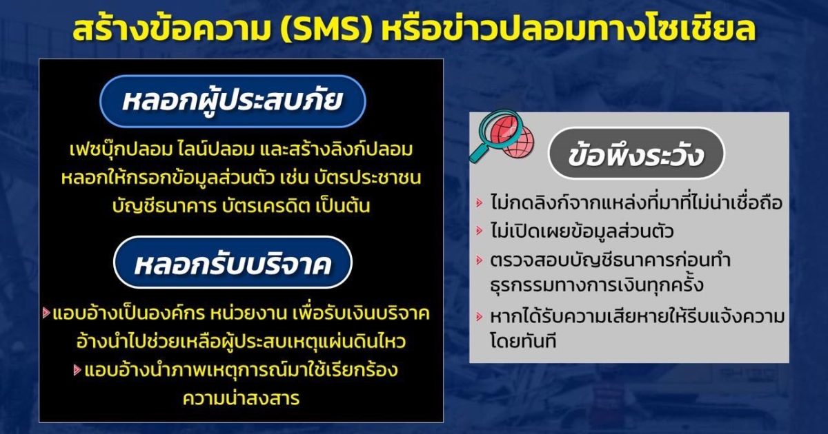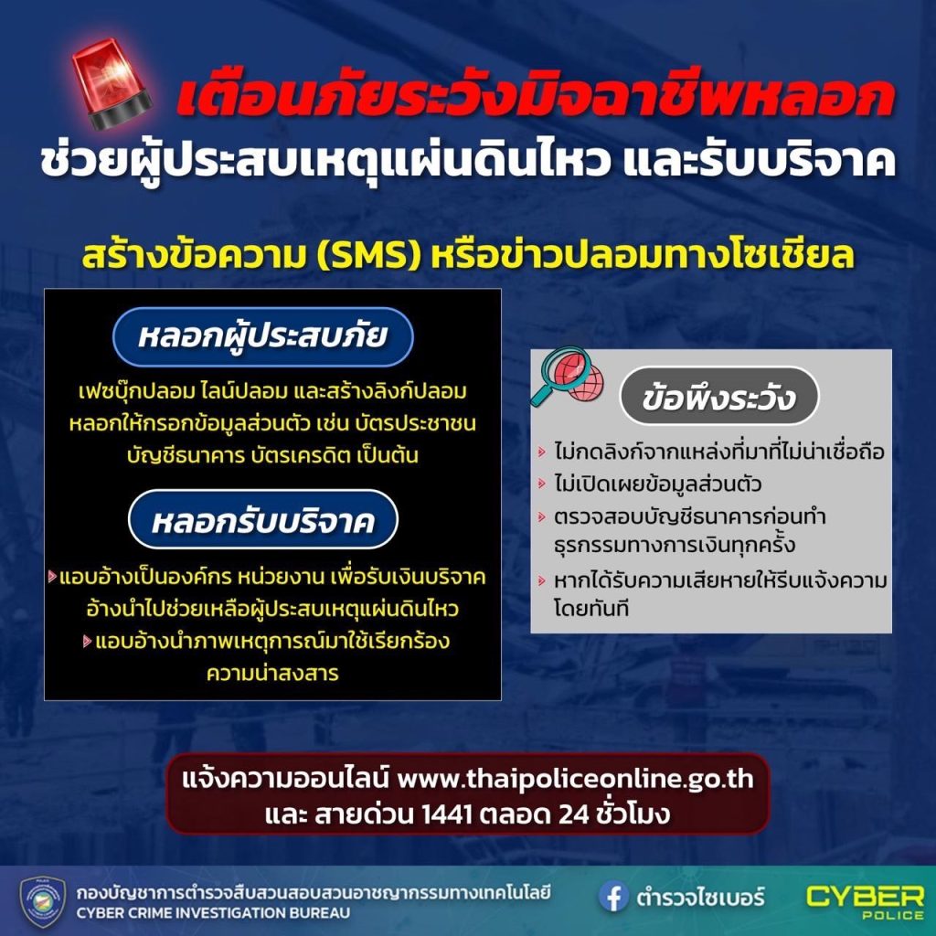 จากสถานการณ์ภัยพิบัติแผ่นดินไหวที่เกิดขึ้นในประเทศไทย ขณะนี้หน่วยงานภาครัฐและเอกชนกำลังเร่งให้ความช่วยเหลือผู้ประสบเหตุอย่างเต็มที่ อย่างไรก็ตาม ขอให้ประชาชนเพิ่มความระมัดระวัง เนื่องจากอาจมีกลุ่มมิจฉาชีพฉวยโอกาสก่อเหตุหลอกลวงในรูปแบบต่างๆ